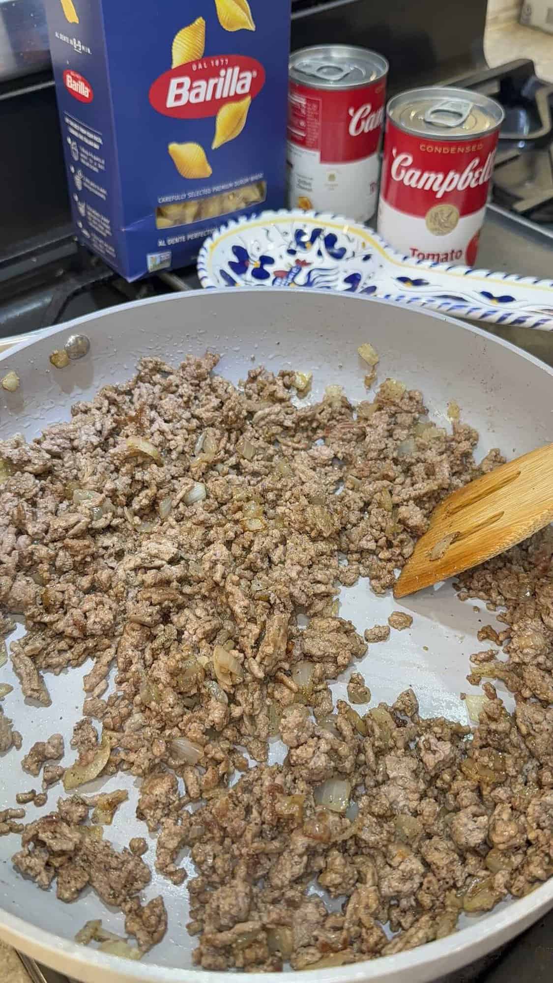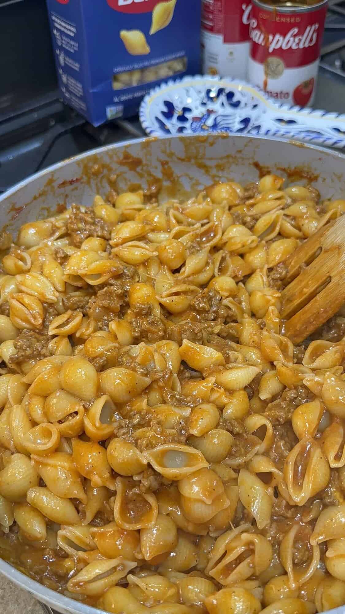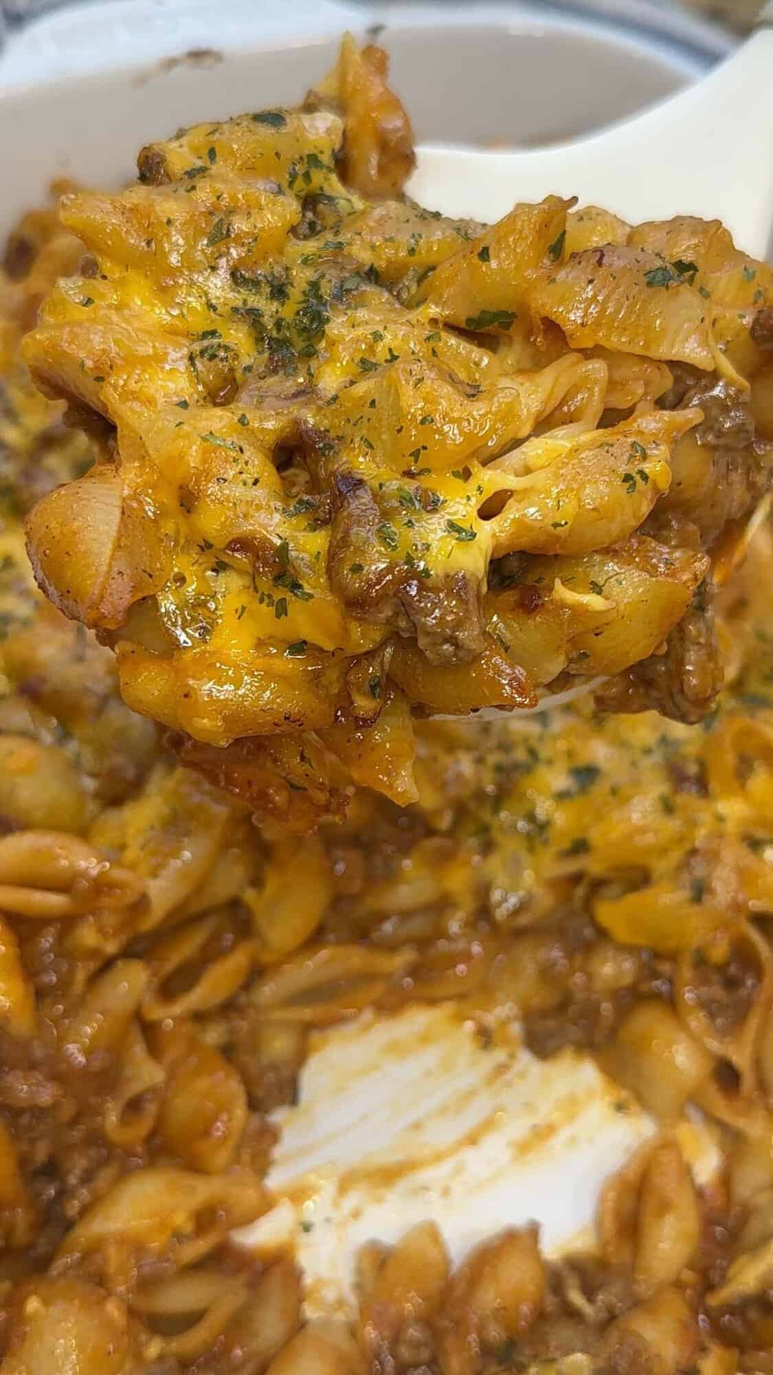 This easy cheeseburger casserole is made with seasoned ground beef, pasta shells, tomato soup and just a few other simple ingredients.