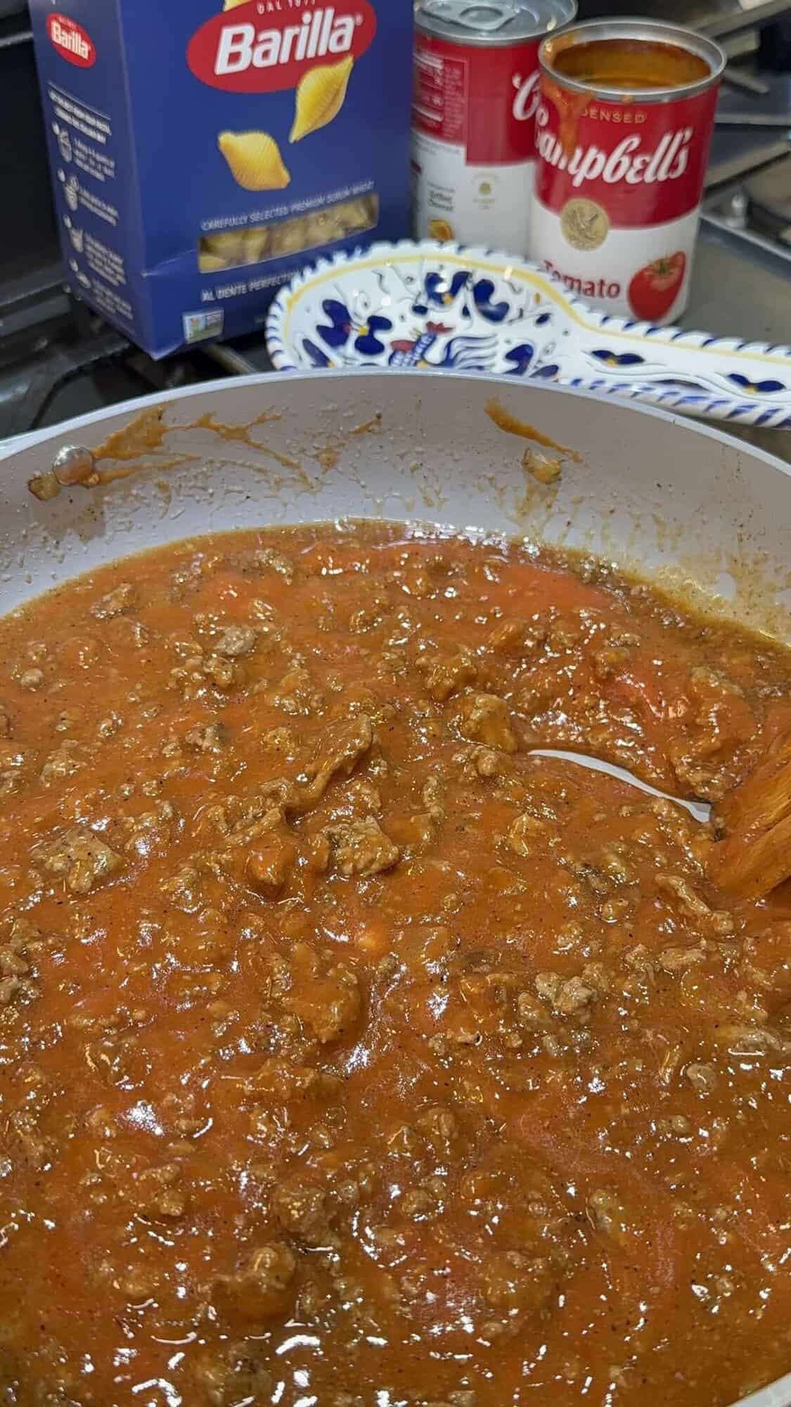 Stir in the worcestershire sauce and let it cook for 1 minute then stir in the tomato soups and water. Turn the heat down to low and let it simmer for about 5 minutes.