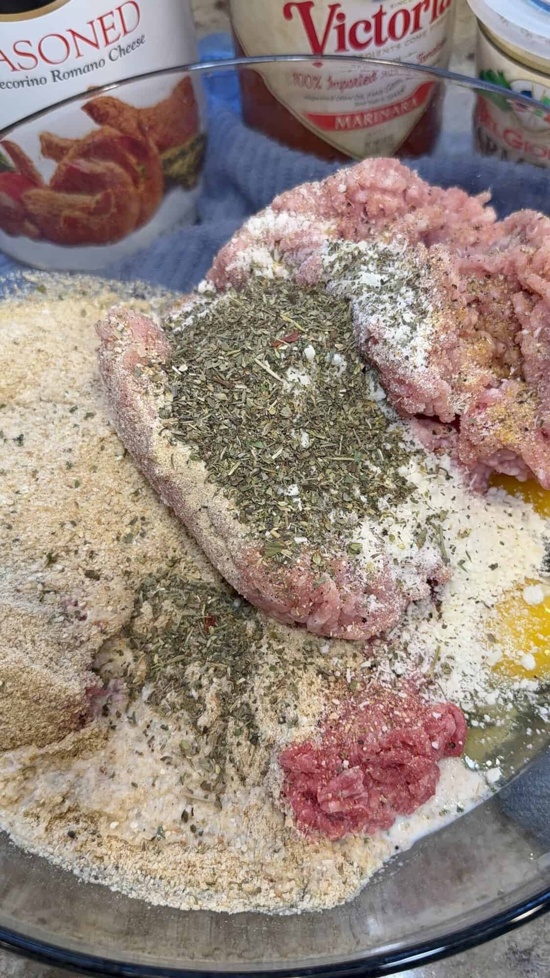 - In a large bowl, add the ground beef, pork, veal, eggs, salt, pepper, garlic powder, onion powder, ½ Cup parmesan cheese and Italian seasoning. Add the breadcrumbs and pour the milk on top to let them soak in.