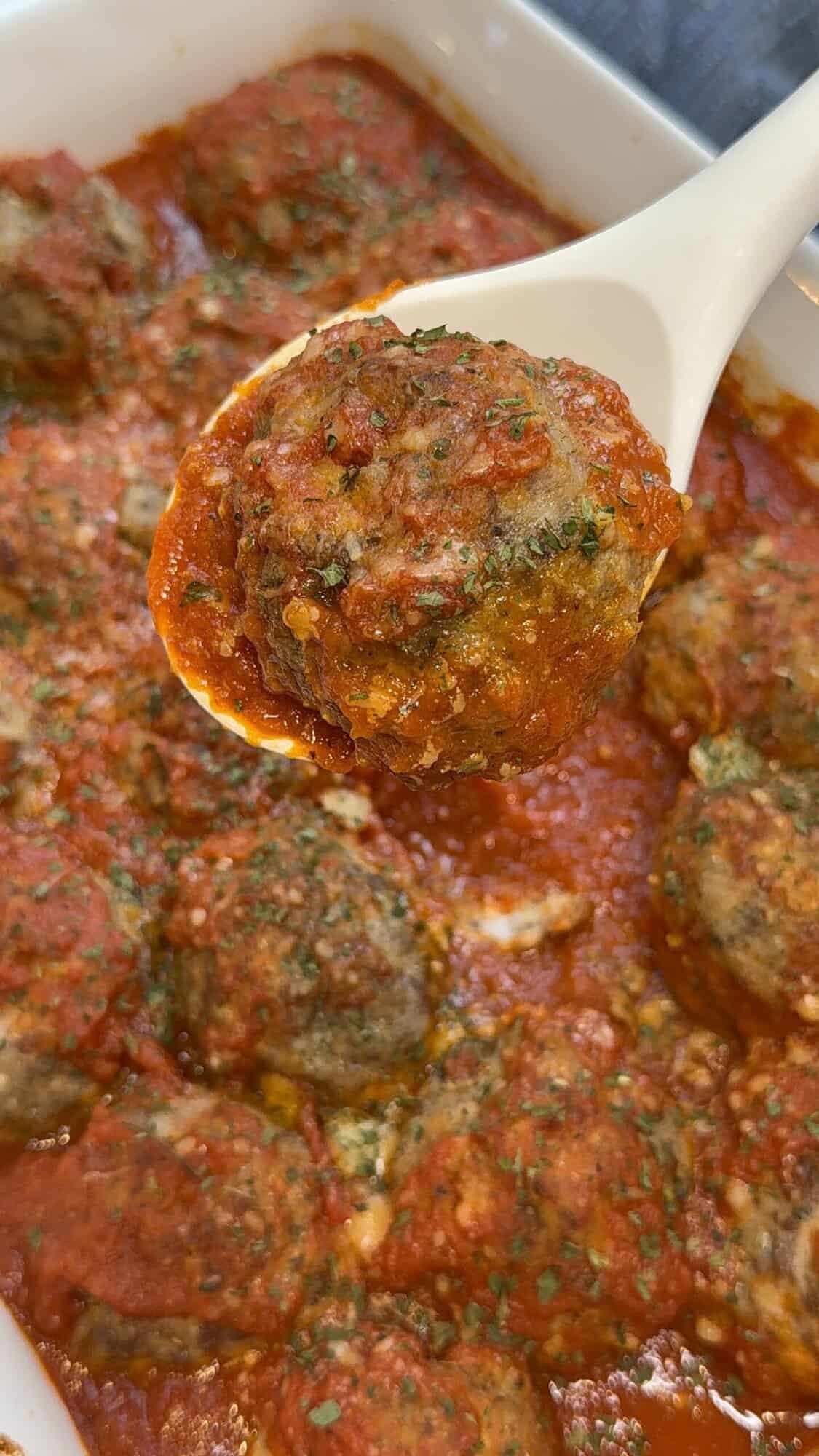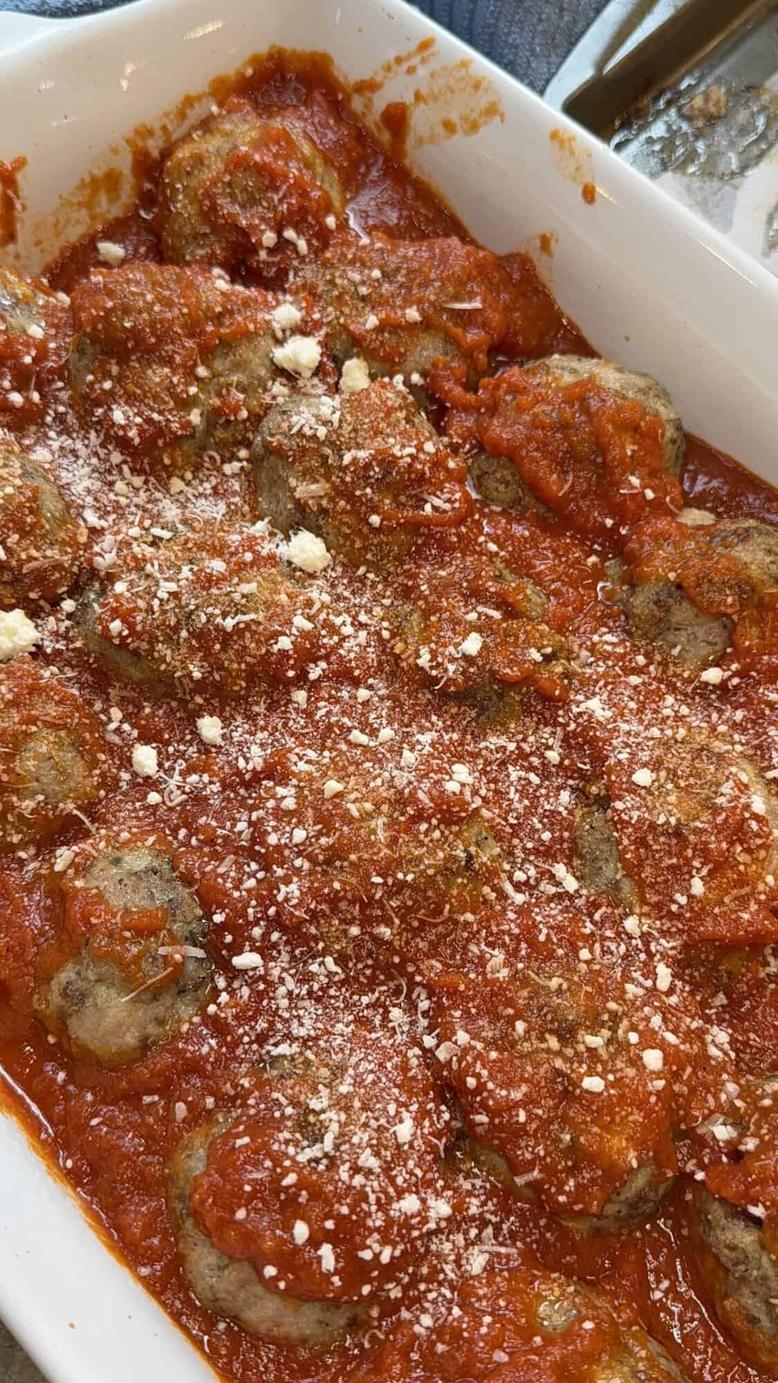 In the meantime, place most of the tomato sauce into a 9 x 13" baking dish and nestle the meatballs in once they're out of the oven. Cover them with the remaining sauce and sprinkle the top with ¼ Cup of parmesan cheese.
