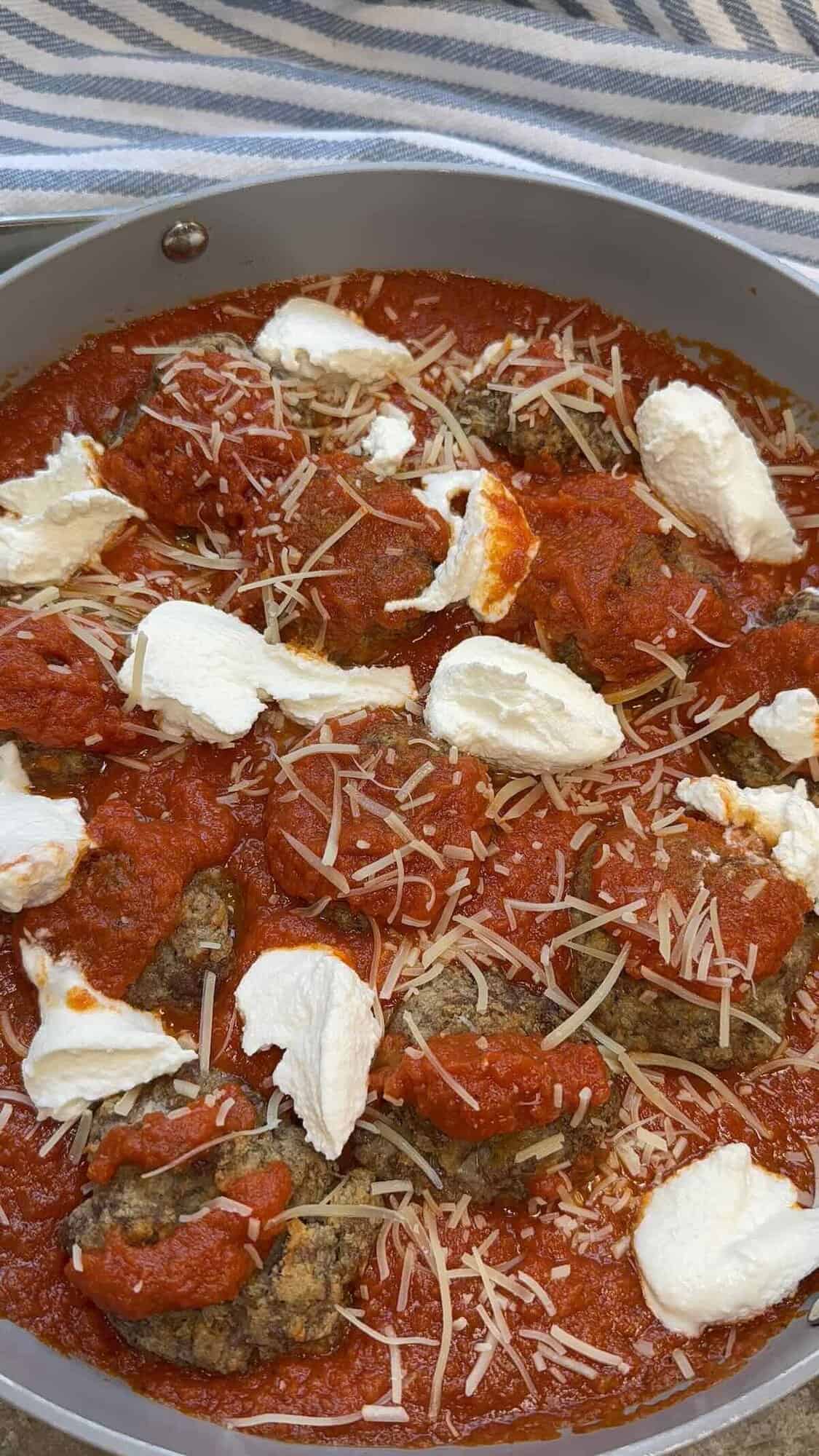 Now, add the marinara sauce to the bottom of a baking dish or a large oven safe skillet. Once the meatballs are done baking, nestle them into the marinara sauce. Spoon some of the sauce over the meatballs. Lightly sprinkle with Parmesan cheese and add a few dollops of ricotta in between the meatballs.