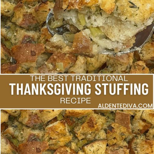The best tradition Thanksgiving stuffing recipe is made with the perfect mix of crunchy homemade sourdough croutons and soft a herby center.