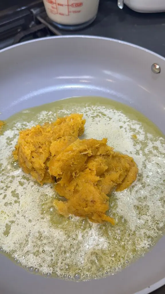 First, slice the squash (vertically) and scoop out the seeds. Rub each half with olive oil, lightly season it with salt and pepper and place it skin side up on a parchment paper lined baking sheet. Roast it for about 45 minutes or until it’s soft. Let it cool for about 10 minutes before scooping the filling out and mashing it into a smooth puree.
