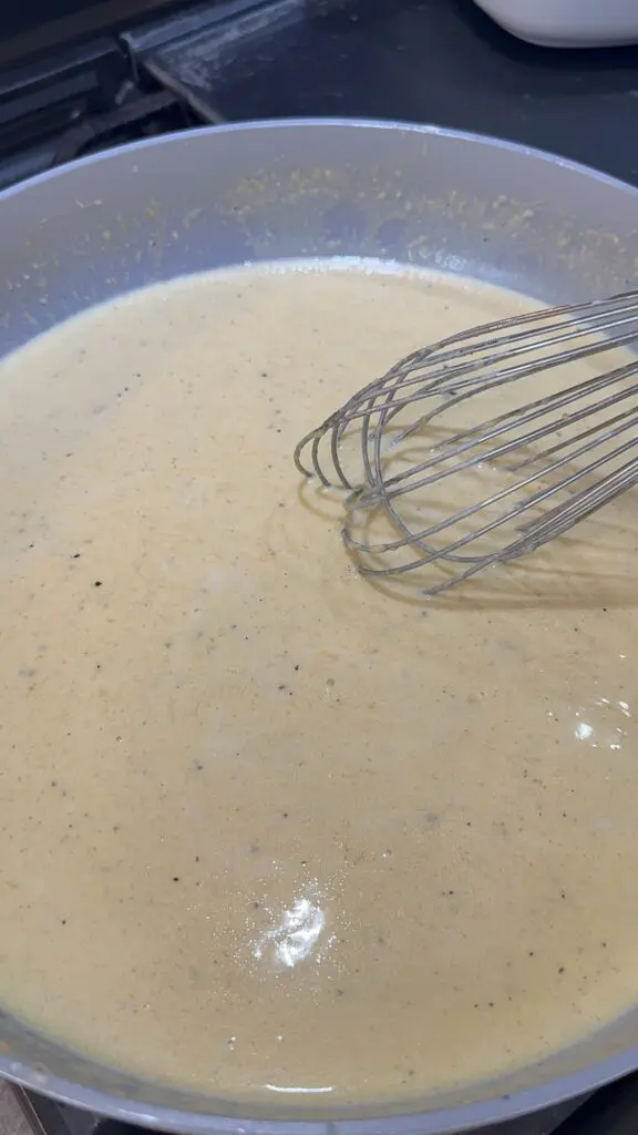 - Slowly whisk in the cream and milk. Lower the heat and let it simmer for about 2 minutes.