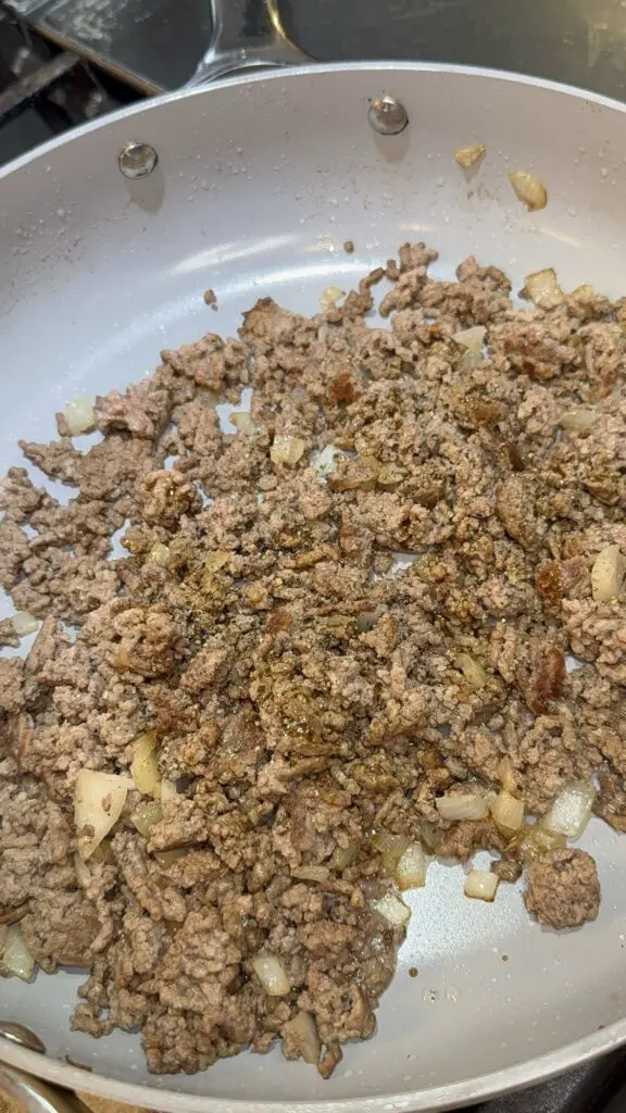 Then, in a large skillet, brown the beef and diced onion together until the meat is cooked all the way through and the onion is soft. Drain the fat if necessary and season with salt, pepper and garlic powder.