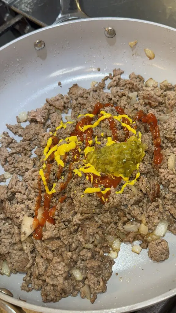 Now, stir in the Worcestershire sauce, ketchup, yellow mustard and relish. Let the beef mixture cool slightly.