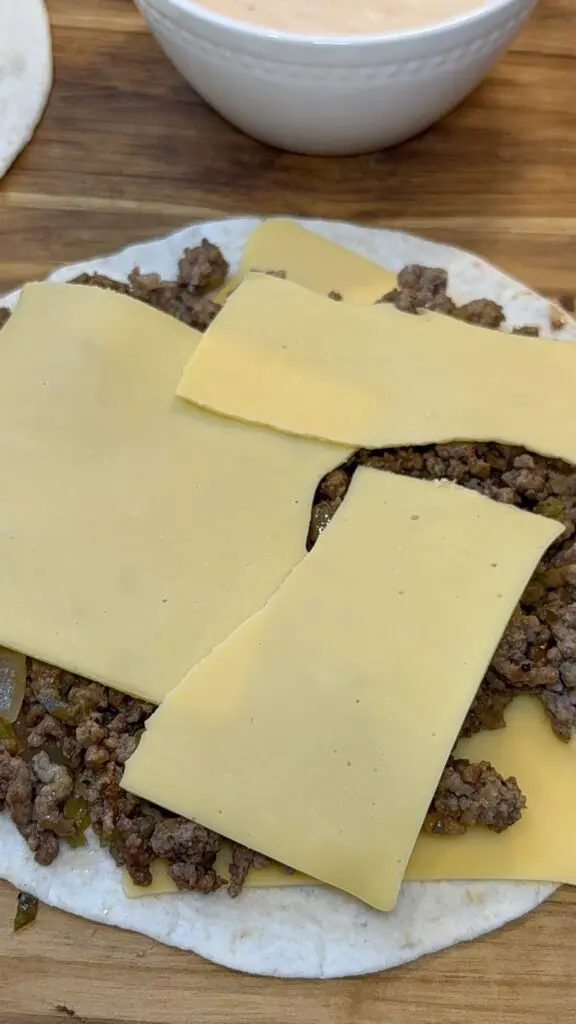 - Add 2-3 slices of cheese down onto half of the tortillas and evenly distribute the beef mixture. Add a couple more slices of cheese to the top of the beef and add another tortilla to close it up.