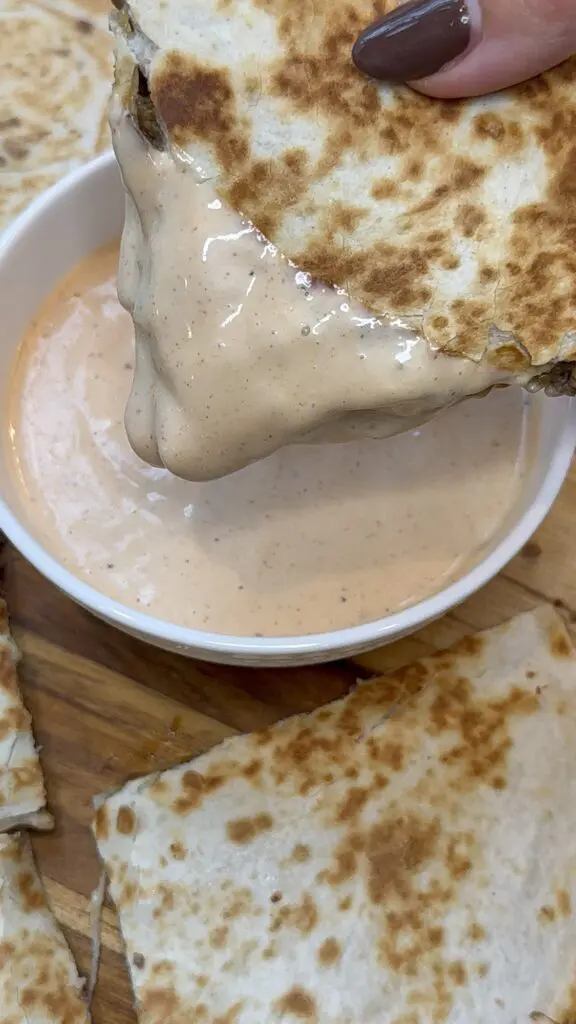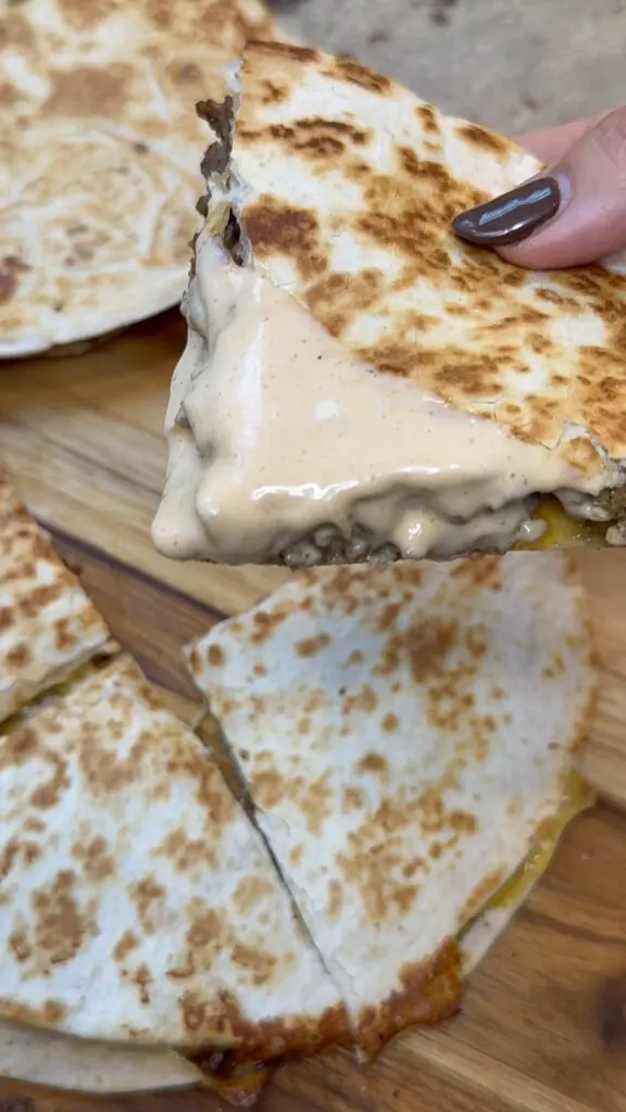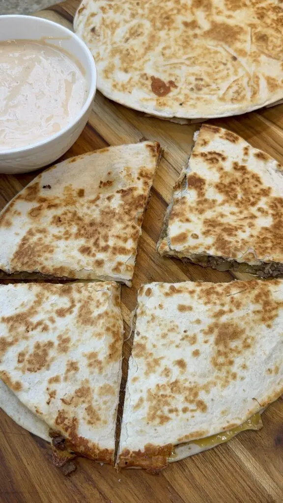 Cheeseburger quesadillas with dipping sauce are a delicious fusion of a classic cheeseburger and a crispy quesadilla. It combines seasoned beef and melted cheese inside golden toasted tortillas for the perfect mash-up meal.