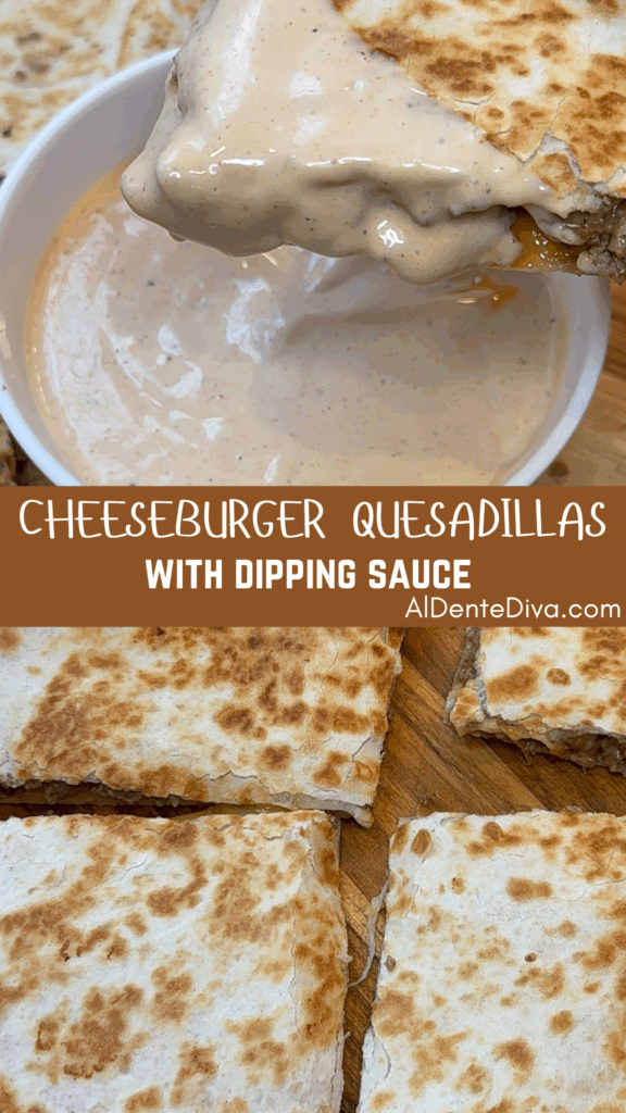 Cheeseburger quesadillas with dipping sauce are made with seasoned ground beef and melted American cheese tucked between toasted tortillas and served with a delicious homemade dipping sauce.
