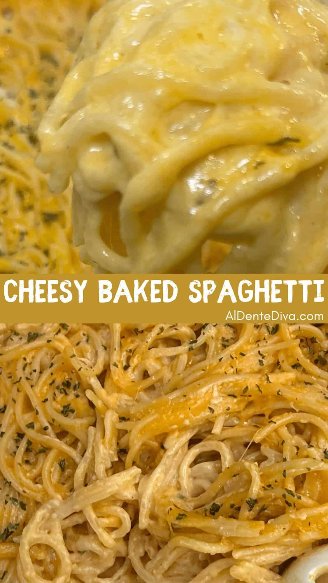 Cheesy baked spaghetti is ultimate comfort food made with spaghetti tossed in an easy to make cheese sauce then baked until golden brown and bubbly.
