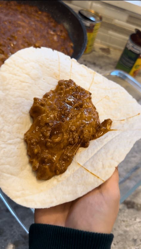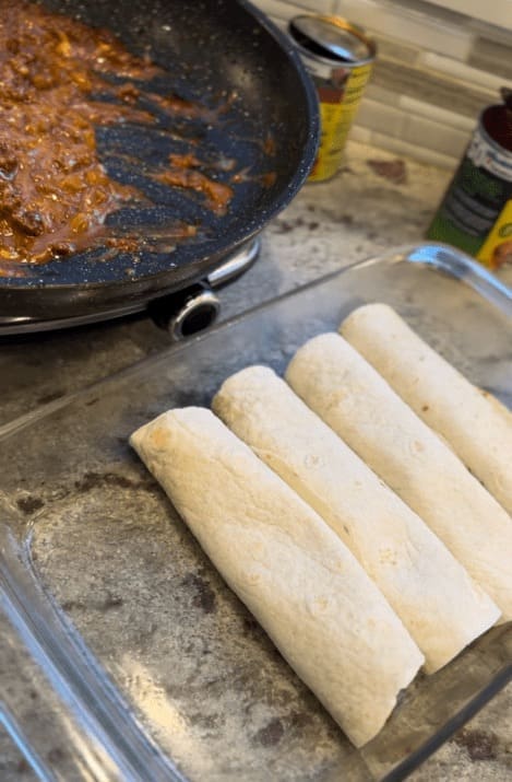- Now evenly distribute the beef filling into the center of each tortilla. Roll each tortilla up and place them seam side down into a greased baking dish.