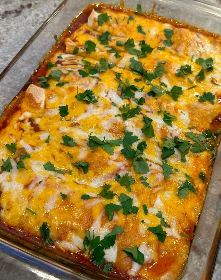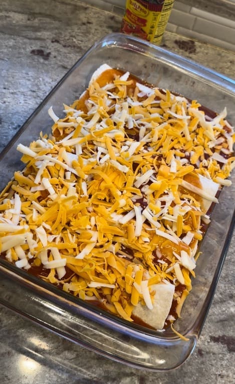 - Next, pour more enchilada sauce over the rolled tortillas and top it with the rest of the shredded cheeses.