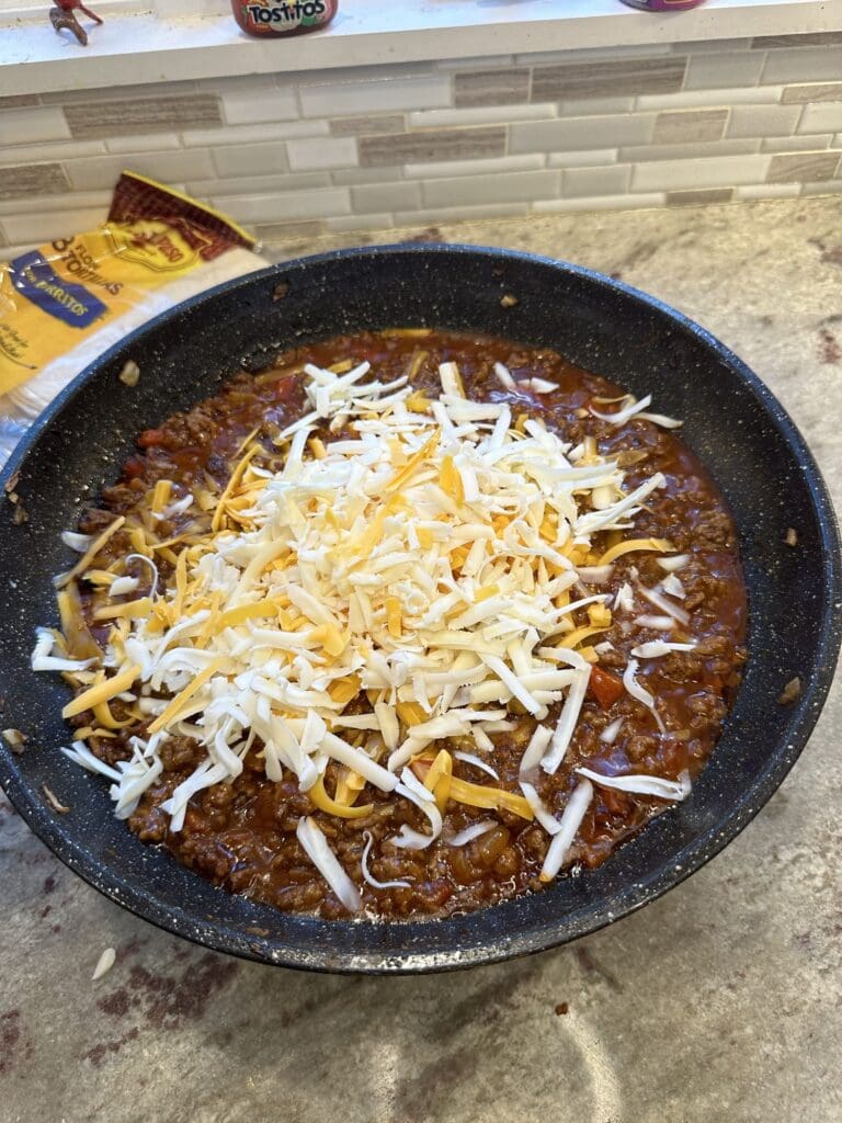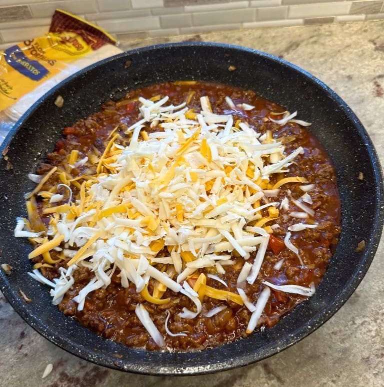 - Next, turn the heat off and add enchilada sauce and shredded cheese. Stir everything together until it’s evenly combined.