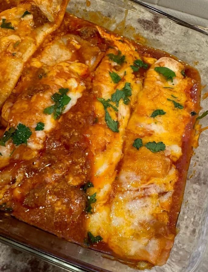 These delicious cheesy beef enchiladas are made with taco seasoned ground beef and shredded cheese rolled into a tortilla and baked in red enchilada sauce until hot and bubbly.