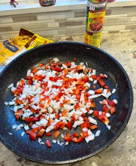 - First, heat the oil in a large skillet and sauté the bell pepper and onion for 5 minutes.