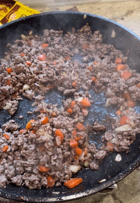 Then add the ground beef. Break it into small pieces and cook it until the beef is brown.