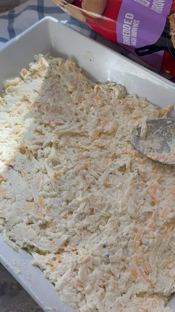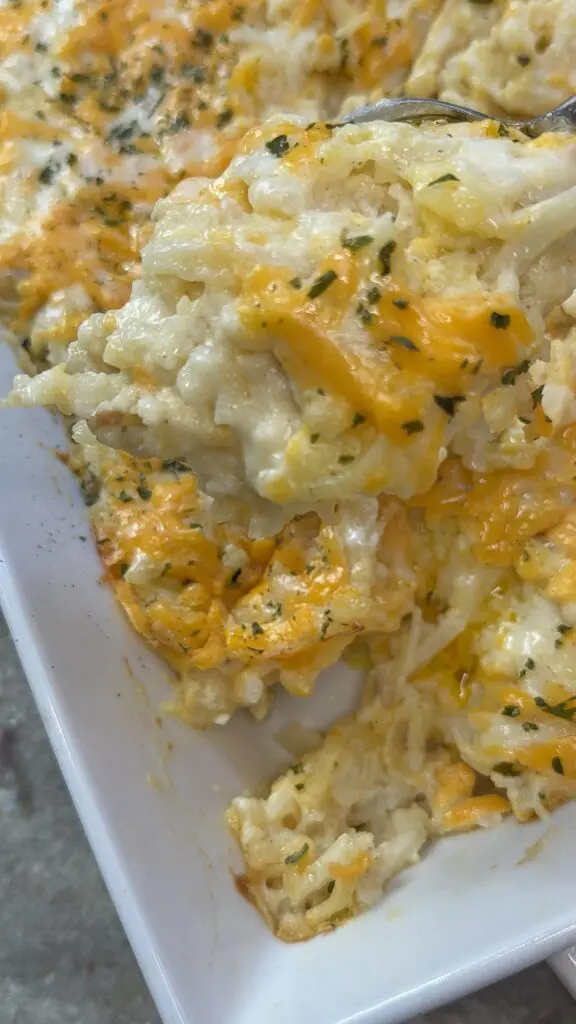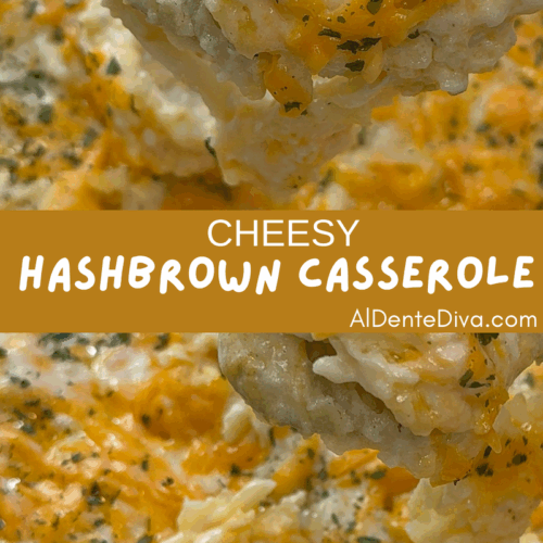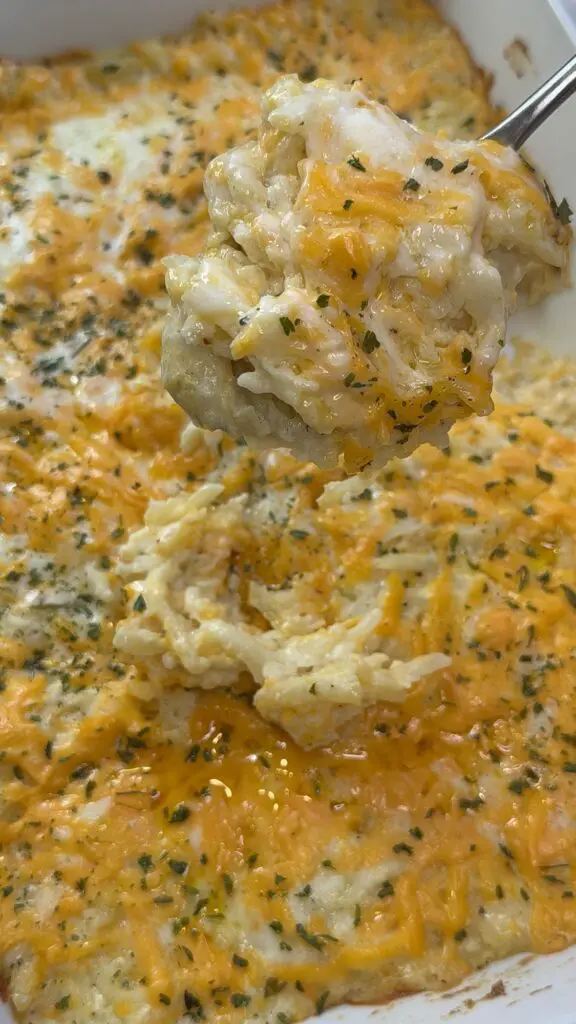 Cheesy hashbrown casserole is loaded with tender shredded potatoes smothered in a rich, creamy sauce and cheddar cheese then baked until bubbly.