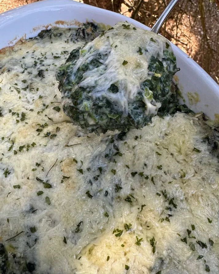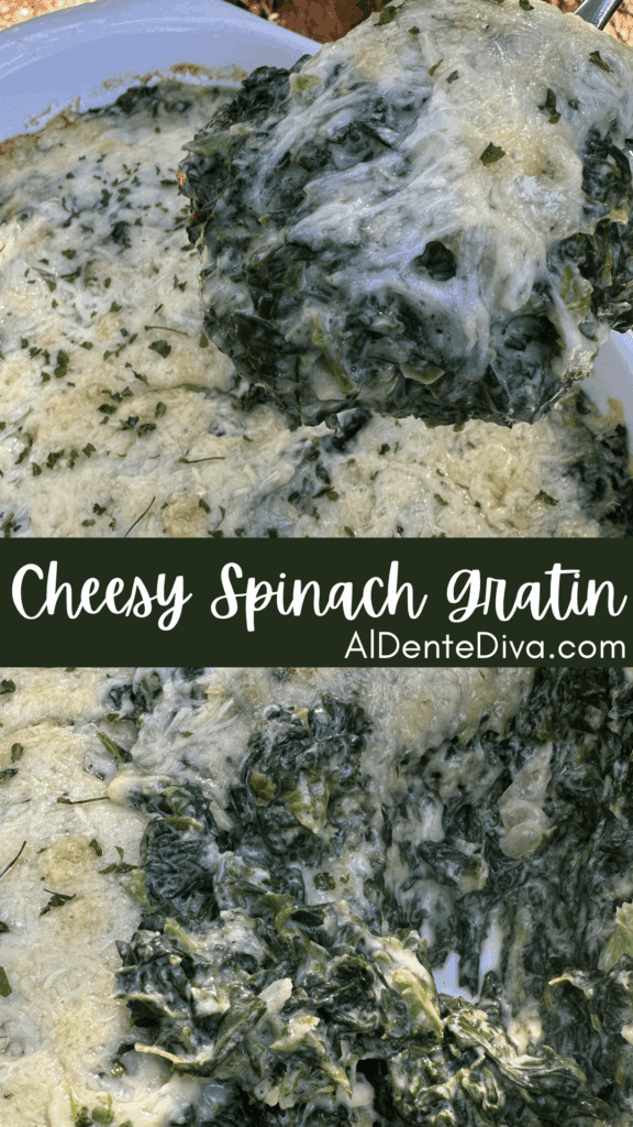 Cheesy spinach gratin is a delicious, crowd pleasing side dish made with chopped spinach baked in a seasoned, creamy sauce and baked with shredded Gruyère cheese.