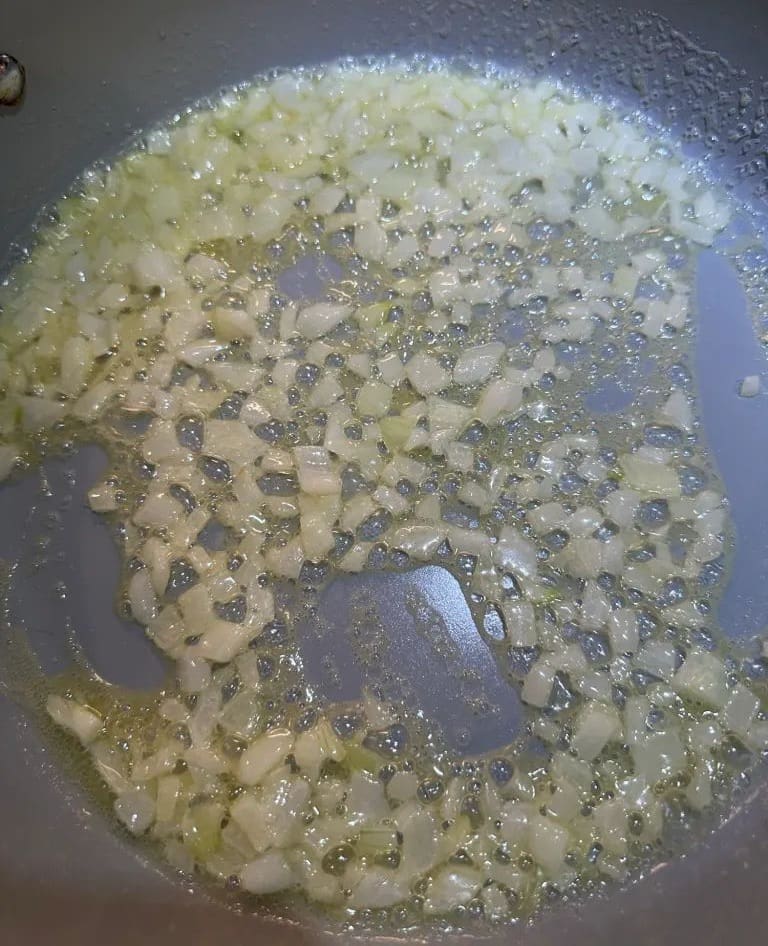 - In a large skillet, sauté onion in butter over medium high heat until it is soft. This should take about 3 minutes.