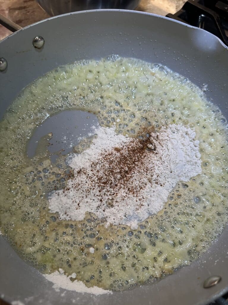 Then, whisk in the flour and nutmeg for about 2 minutes.