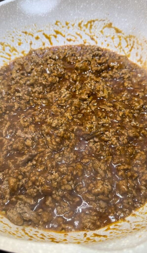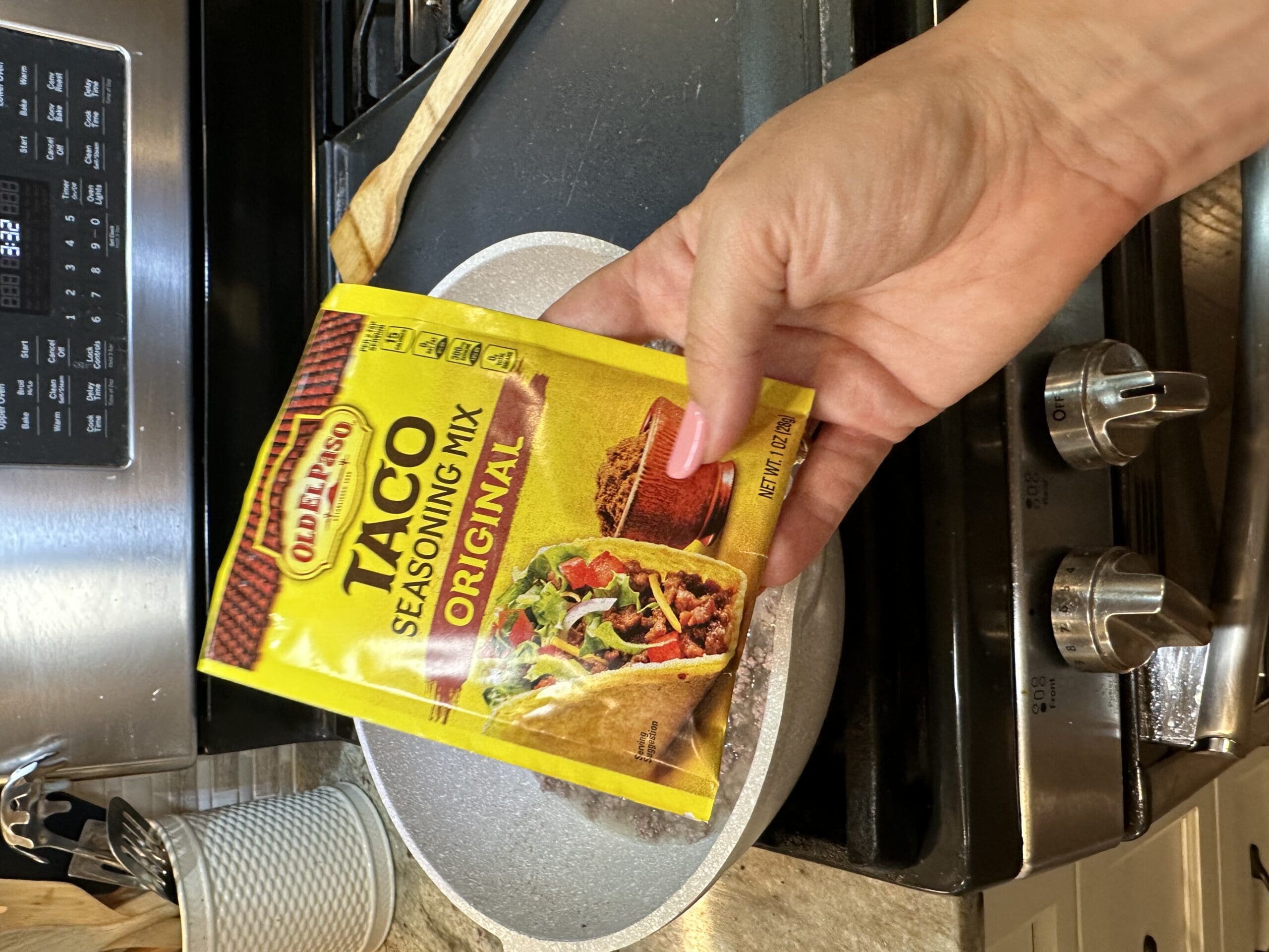 First, brown the ground beef and make it according to the directions on the back of the taco seasoning packet.