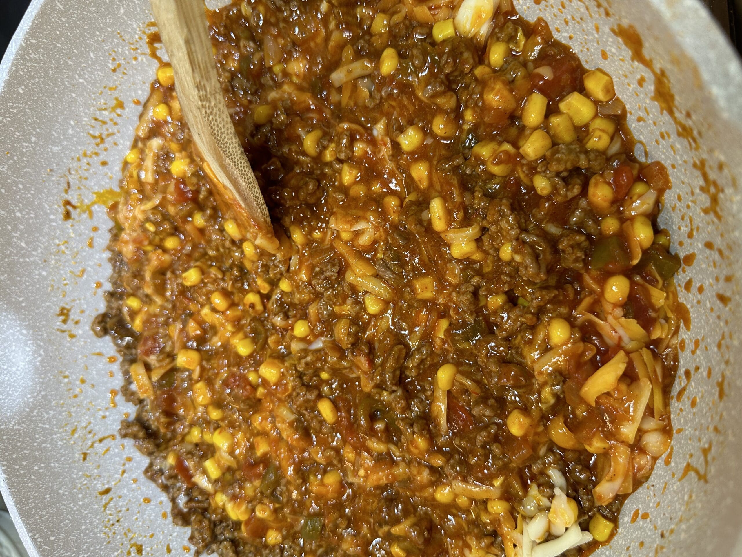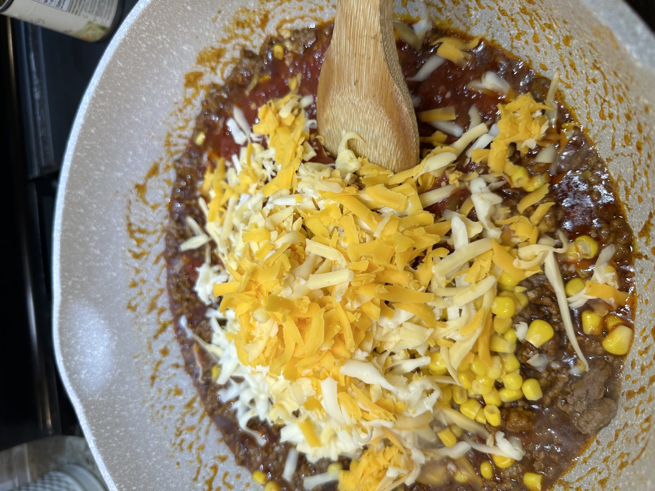 - Now add the beans, corn and half the cheese and mix it together over medium high heat.