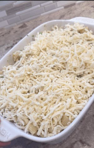 Next, bake it, uncovered, at 350° for about 25 minutes or until the cheese is melted and the sides are hot and bubbly.
