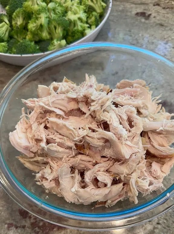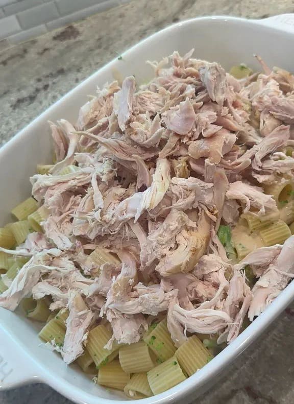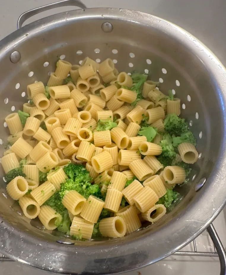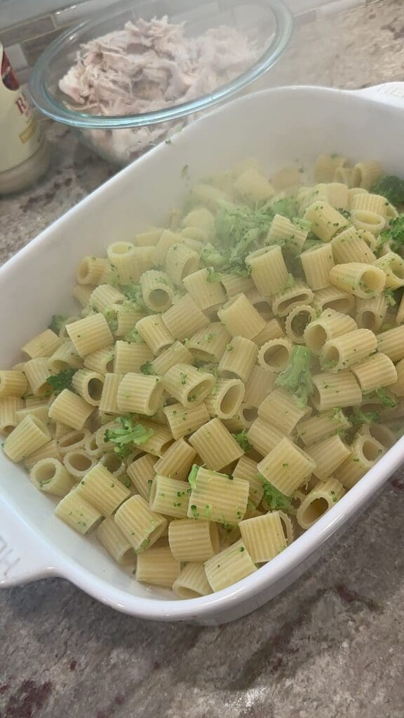 - Now, in a colander, drain the water from the broccoli and pasta and add them to a 9” x 13” baking dish.