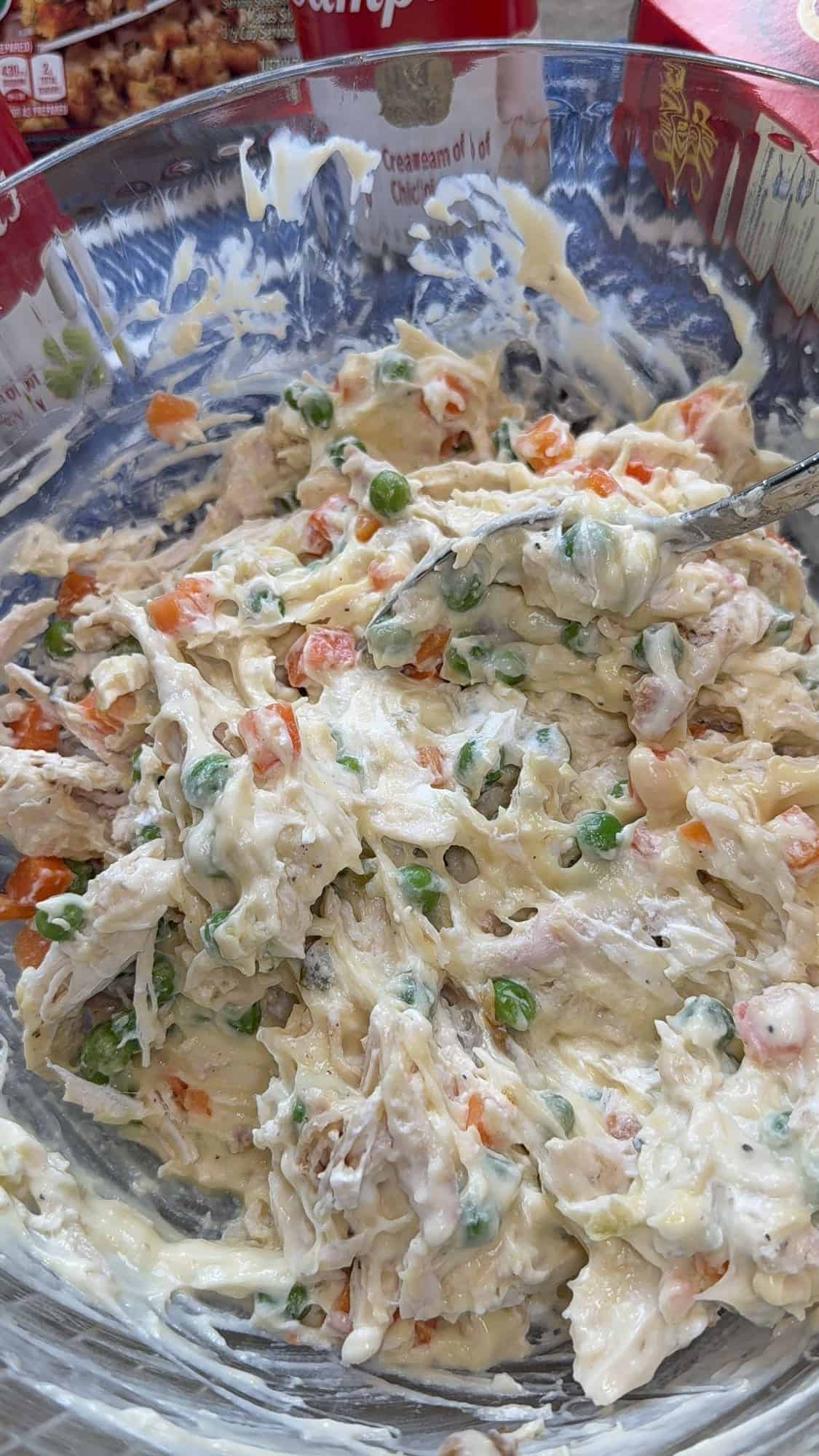 Next, in a large bowl, add the shredded rotisserie chicken and season it with salt, pepper, and garlic powder. Add the cream of chicken soup, cream of celery soup, sour cream and peas and carrots. Mix everything together until it’s evenly combined.