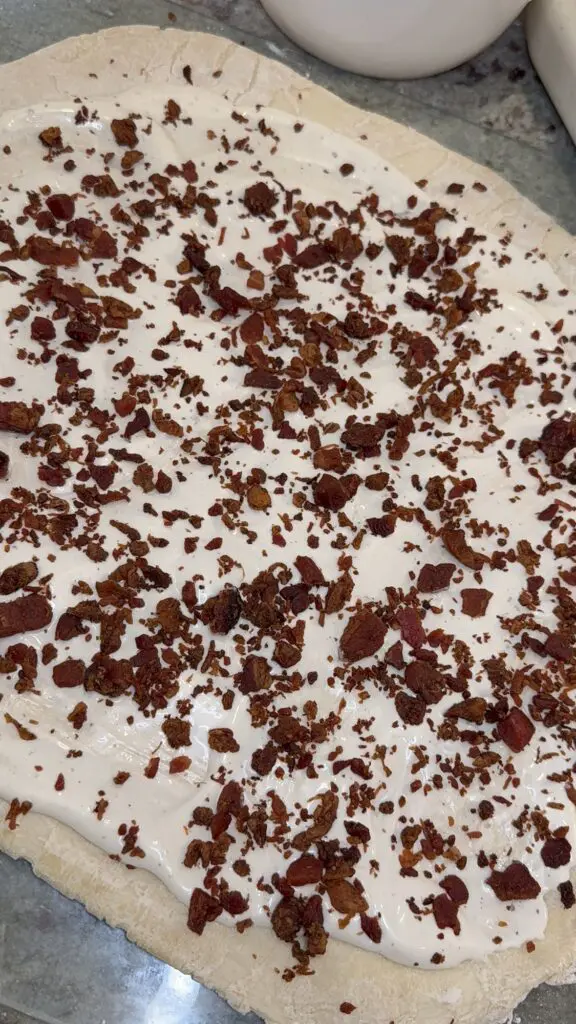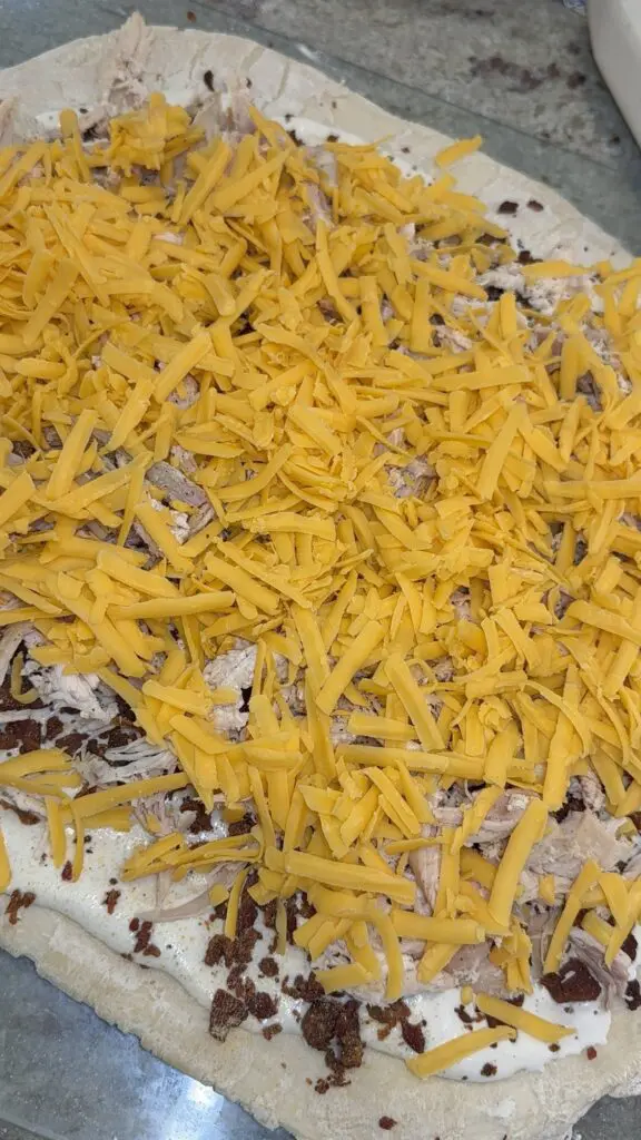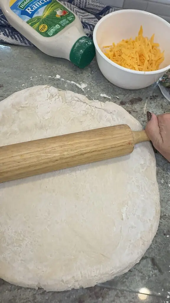 - On a lightly flowered surface roll the pizza dough out into a large rectangle. Add the ranch dressing and smooth it out onto the dough, leaving about an inch clear on all sides.