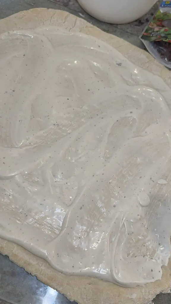 Then, add the ranch dressing and smooth it out onto the dough, leaving about an inch clear on the sides.