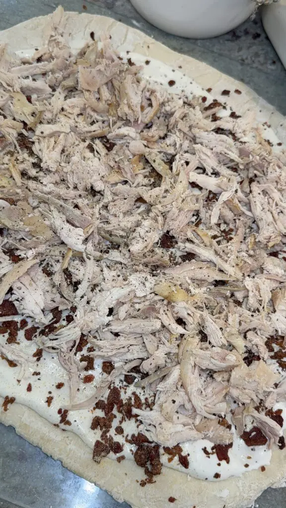 - Evenly distribute the shredded rotisserie chicken on top. Lightly season it with salt, pepper and garlic powder.