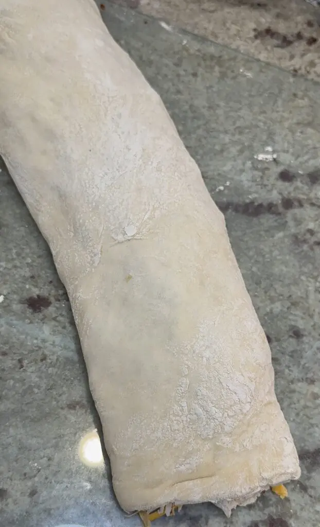 - Starting with the long side of the dough facing you, gently roll it up tightly just like you would a jelly roll. When you reach the end, pinch the seam to seal it and fold the ends under to keep everything inside.
