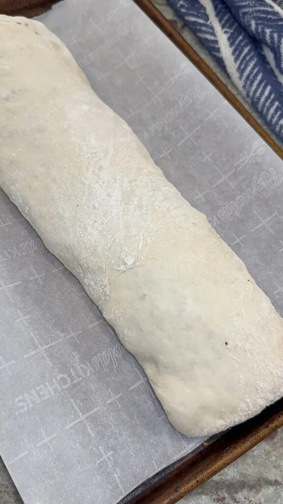 Now, place the Stromboli seam-side down on a parchment paper lined baking sheet.