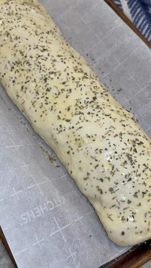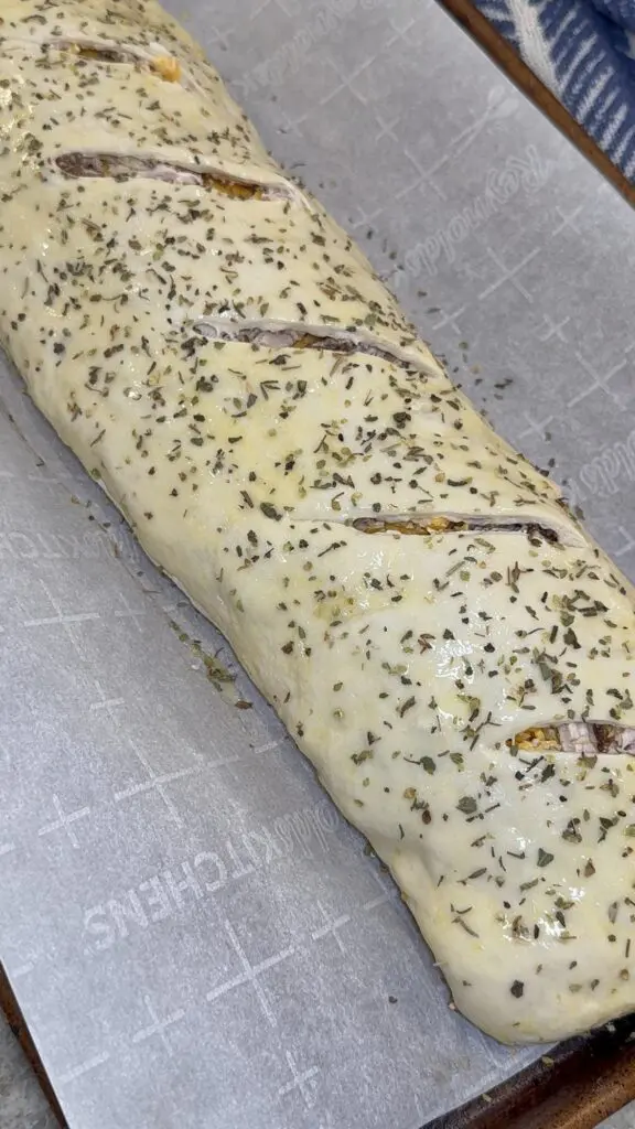 - Place the Stromboli seam-side down on a parchment paper lined baking sheet.