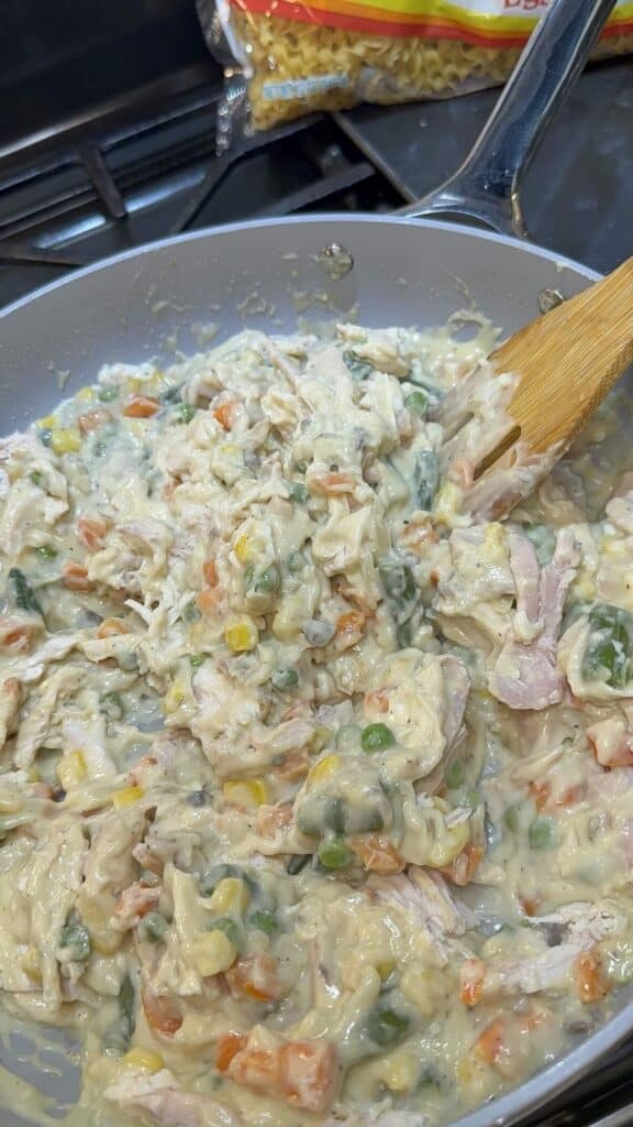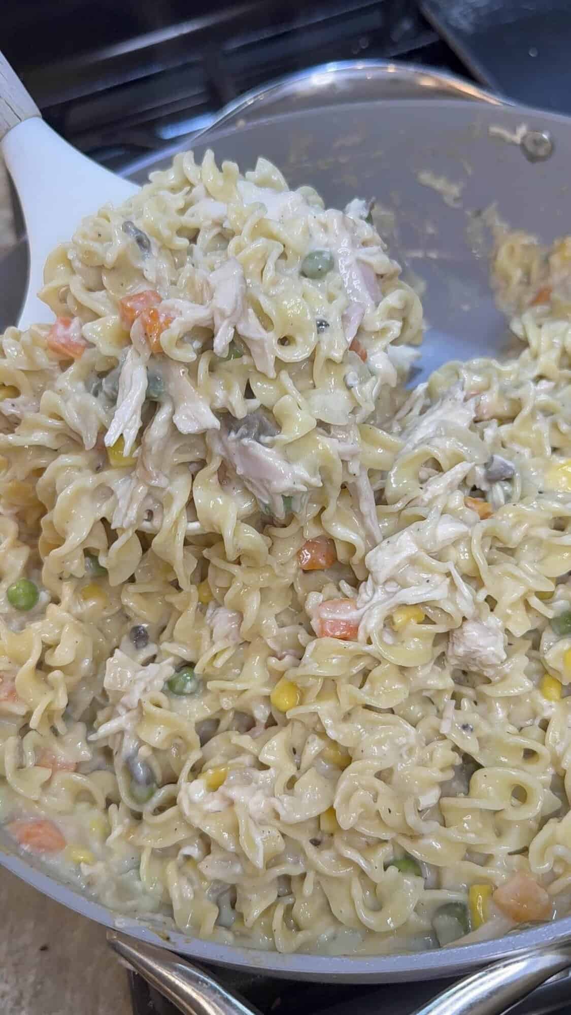 Chicken pot pie pasta has all the delicious flavors of the cozy classic served with egg noodles for an easy to make meal.