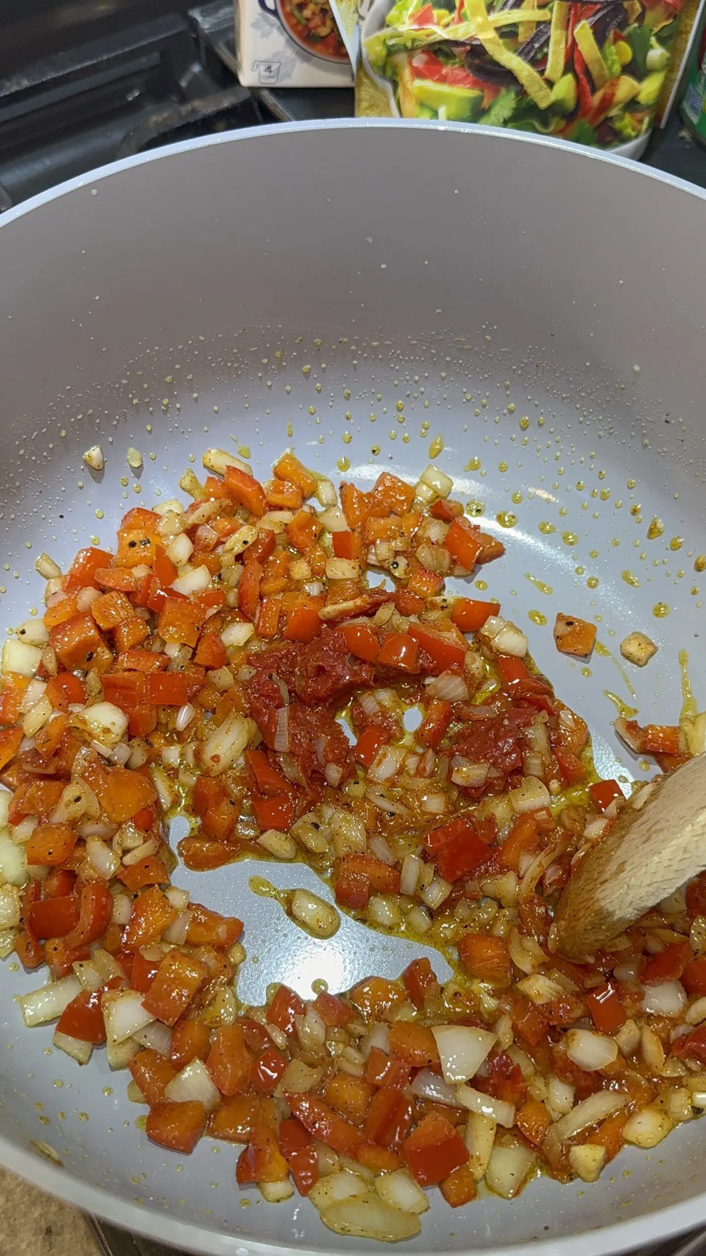 - FHeat the butter and oil in a large pot then add the diced bell peppers and onion. Lightly season them with salt, pepper, cayenne pepper and chili powder. Sauté until the vegetables are soft.