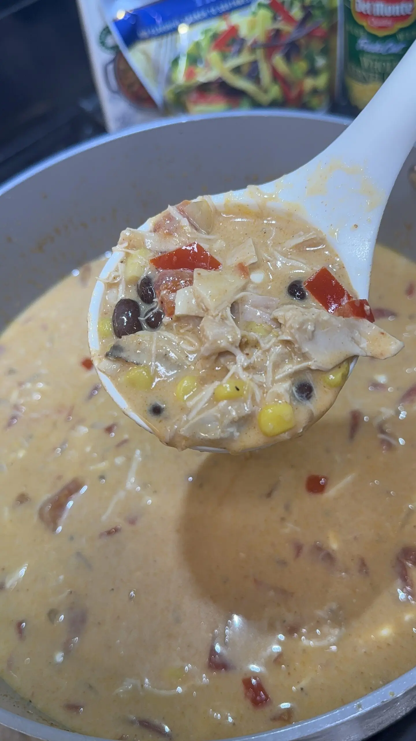 Now stir in the tomato paste and cook for a minute or two. Then add in the chicken broth, corn, beans, rotisserie chicken and diced tomatoes. Add the sour cream, softened cream cheese and taco seasoning. Stir to combine everything and let it simmer for about 10 minutes.