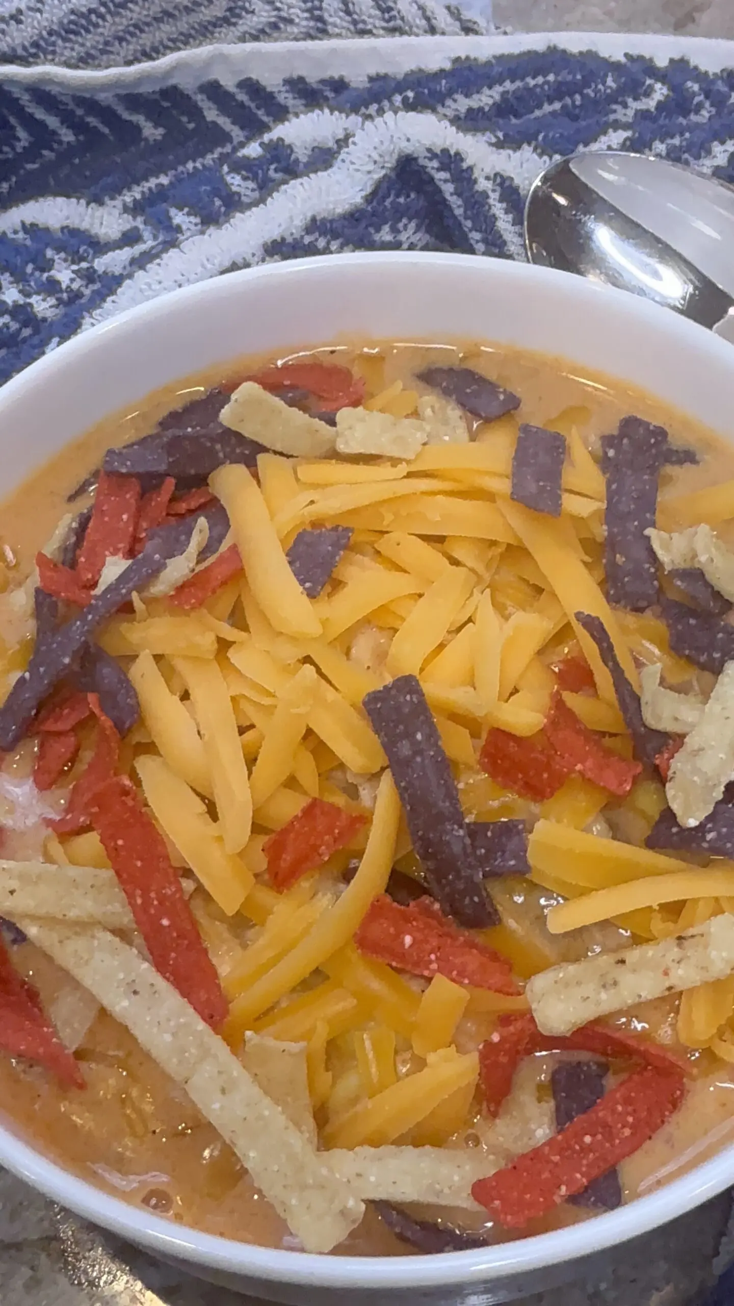 - Finally, transfer the soup into individually portioned out bowls and top with fresh lime juice, crushed tortilla chips, shredded cheddar cheese and sour cream. Enjoy!