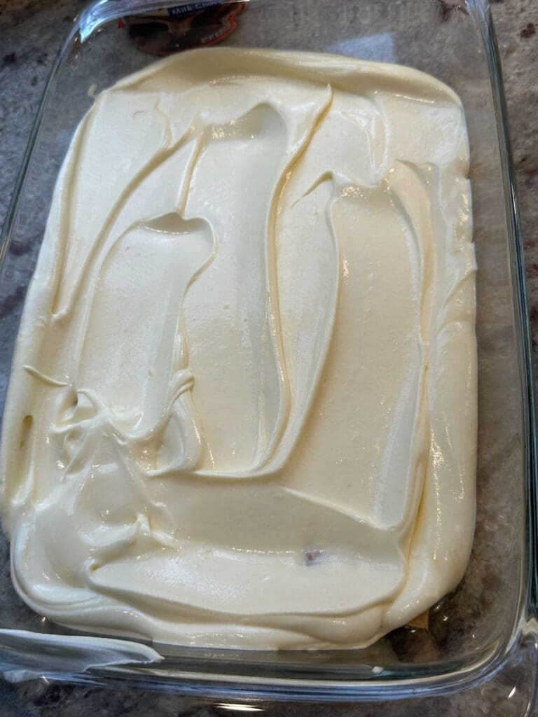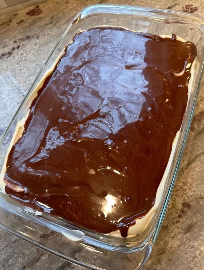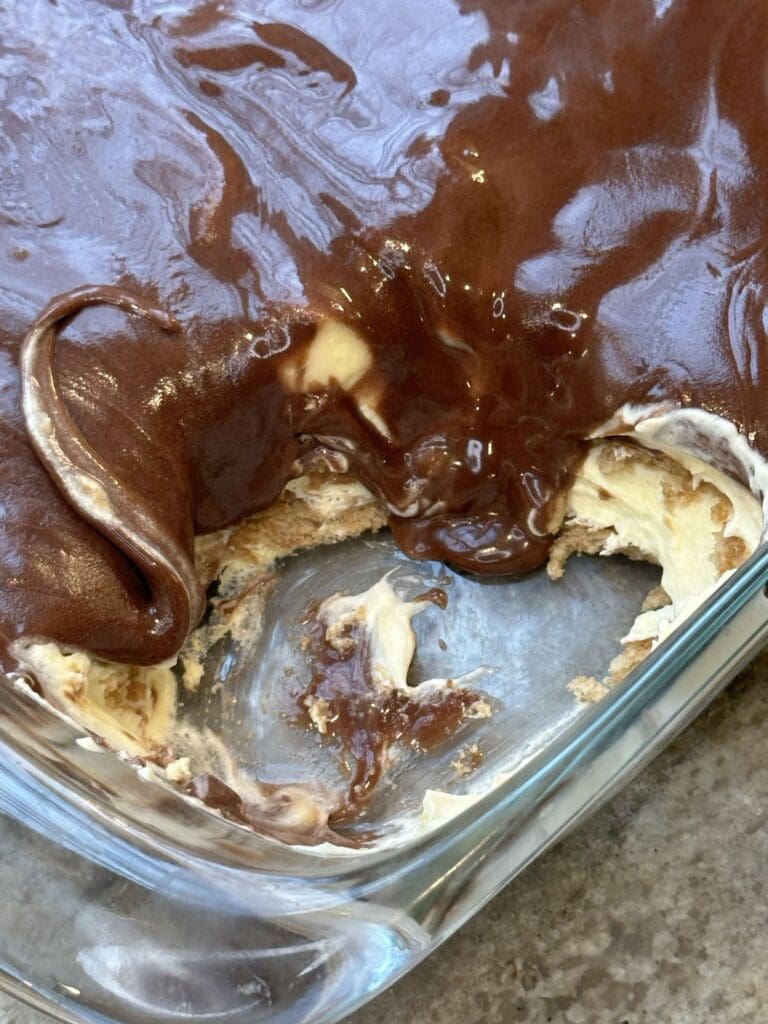 Last layer is Graham crackers. I have made this numerous times. It's really easy and a firehouse favorite. Overnight in fridge is best.
