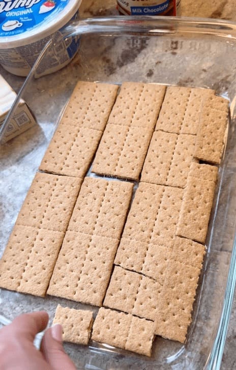 - Now line the bottom of a 9 x 13” baking dish will a layer of the graham crackers. Break them up on their perforated lines to fill up any holes if needed.