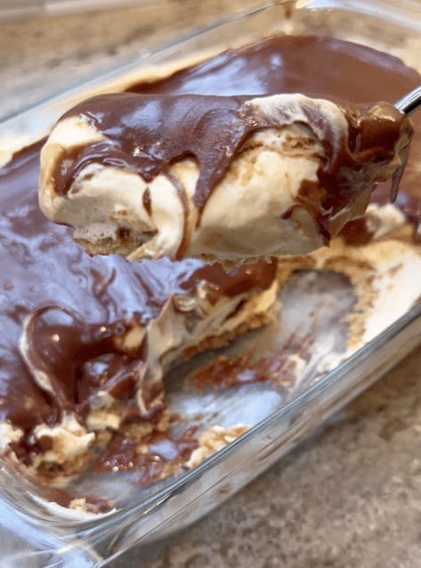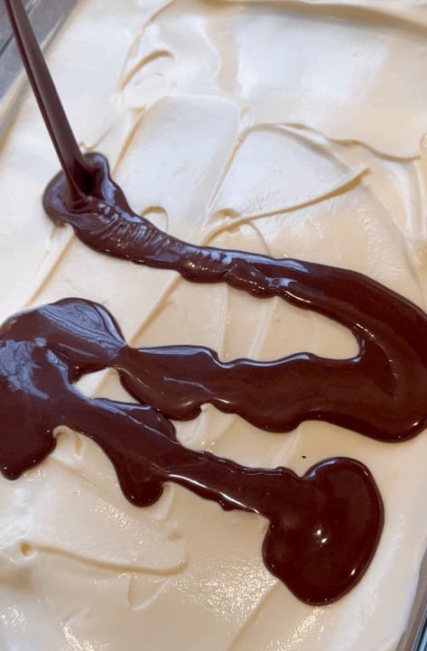 - Then evenly pour the icing over the top of the last layer of graham crackers. Use the back of spoon to carefully smooth it over if needed.