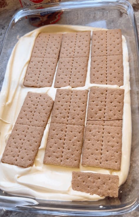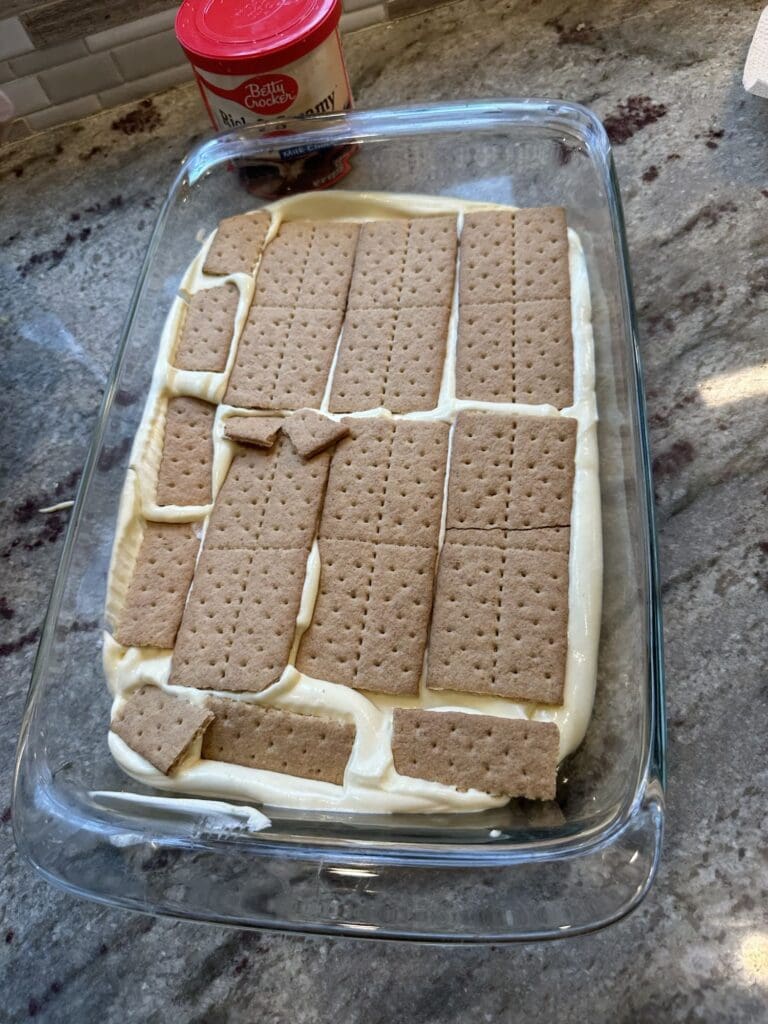 - Then add another layer of graham crackers and add the rest of the pudding mixture.
