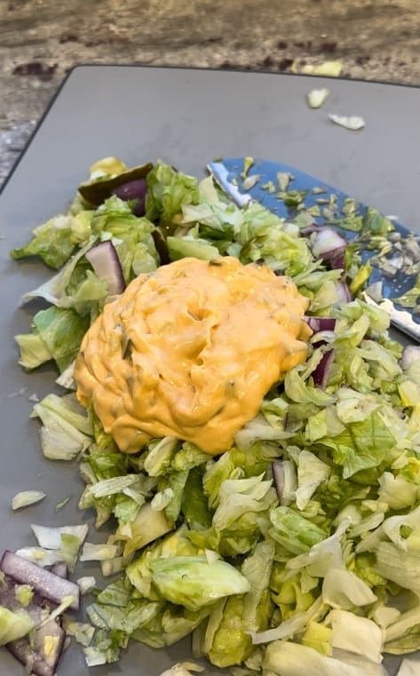 - While that’s baking, add the lettuce, pickles and onions onto a cutting board. Chop the vegetables together into small pieces and then mix in the rest of the Mac Sauce.