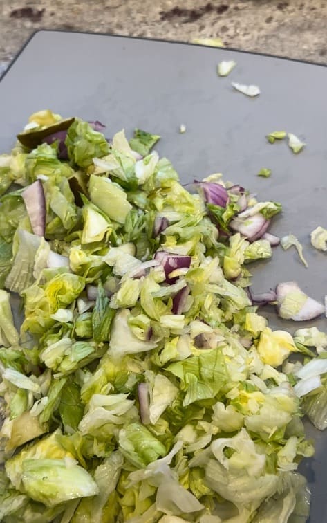 While that’s baking, add the lettuce, pickles and onions onto a cutting board. Chop the vegetables together into small pieces.