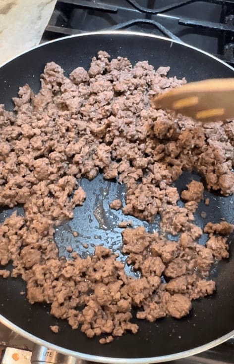 - First, in a large skillet, brown the ground beef while breaking it into small pieces and drain the fat and season with salt, pepper and garlic powder.