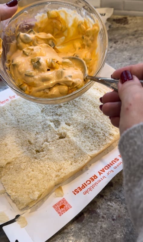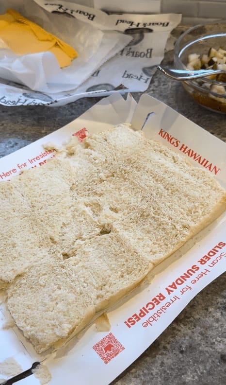 - Next slice the Hawaiian rolls down the middle horizontally separating the bottom and top buns. Place the bottom buns on a parchment paper lined baking sheet (OR you can bake them right in the tray that they come in. Yes, they’re oven safe!) and spread a thin layer of Mac sauce on to them.