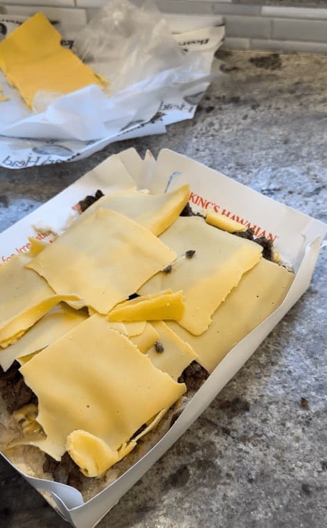 - After that, place a layer of American cheese slices down on top of the beef and add the top half of the buns