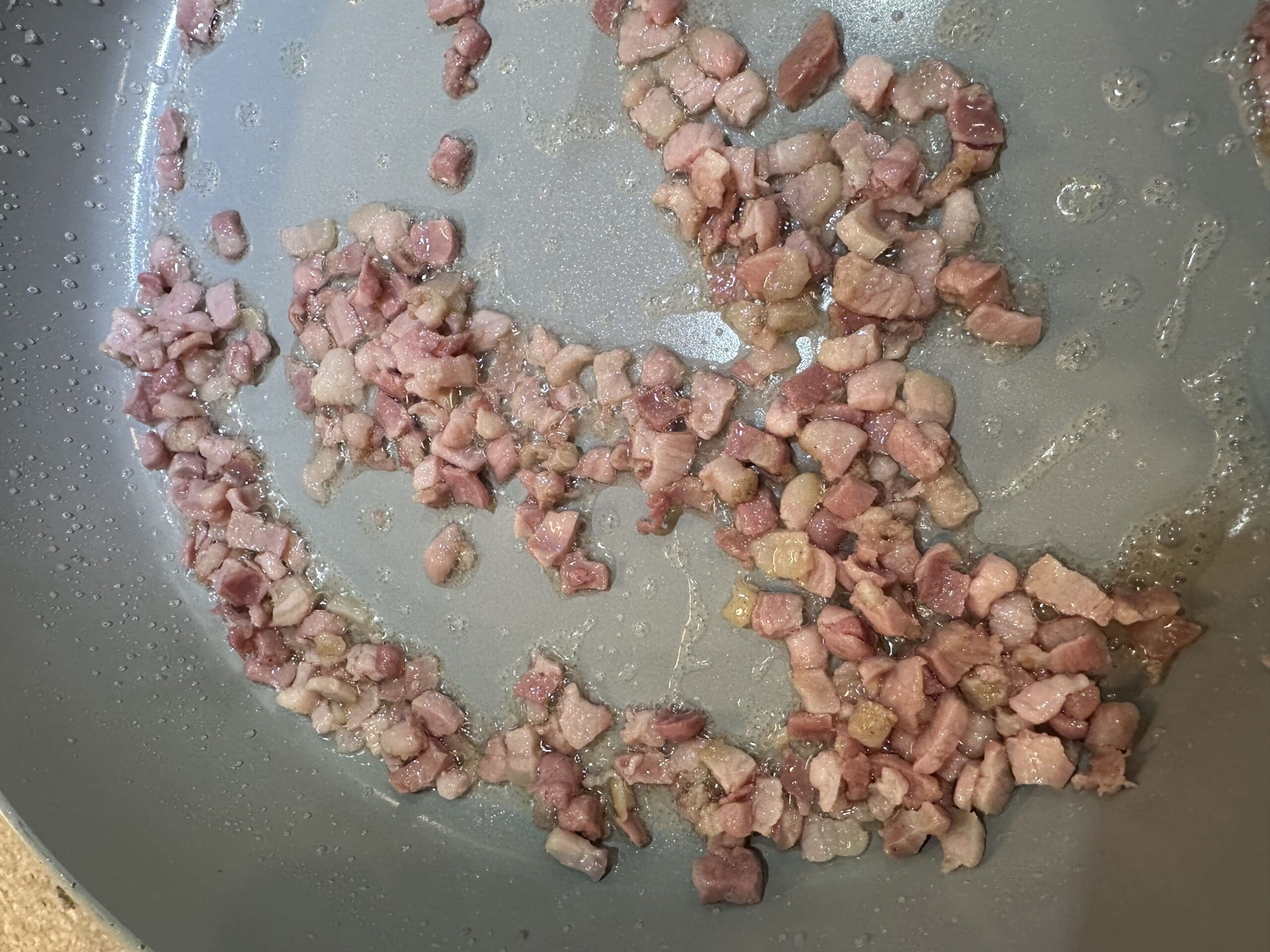 - Add the pancetta to a large skillet with a tall lip over medium high heat. Cook the pancetta, stirring occasionally, until its crispy