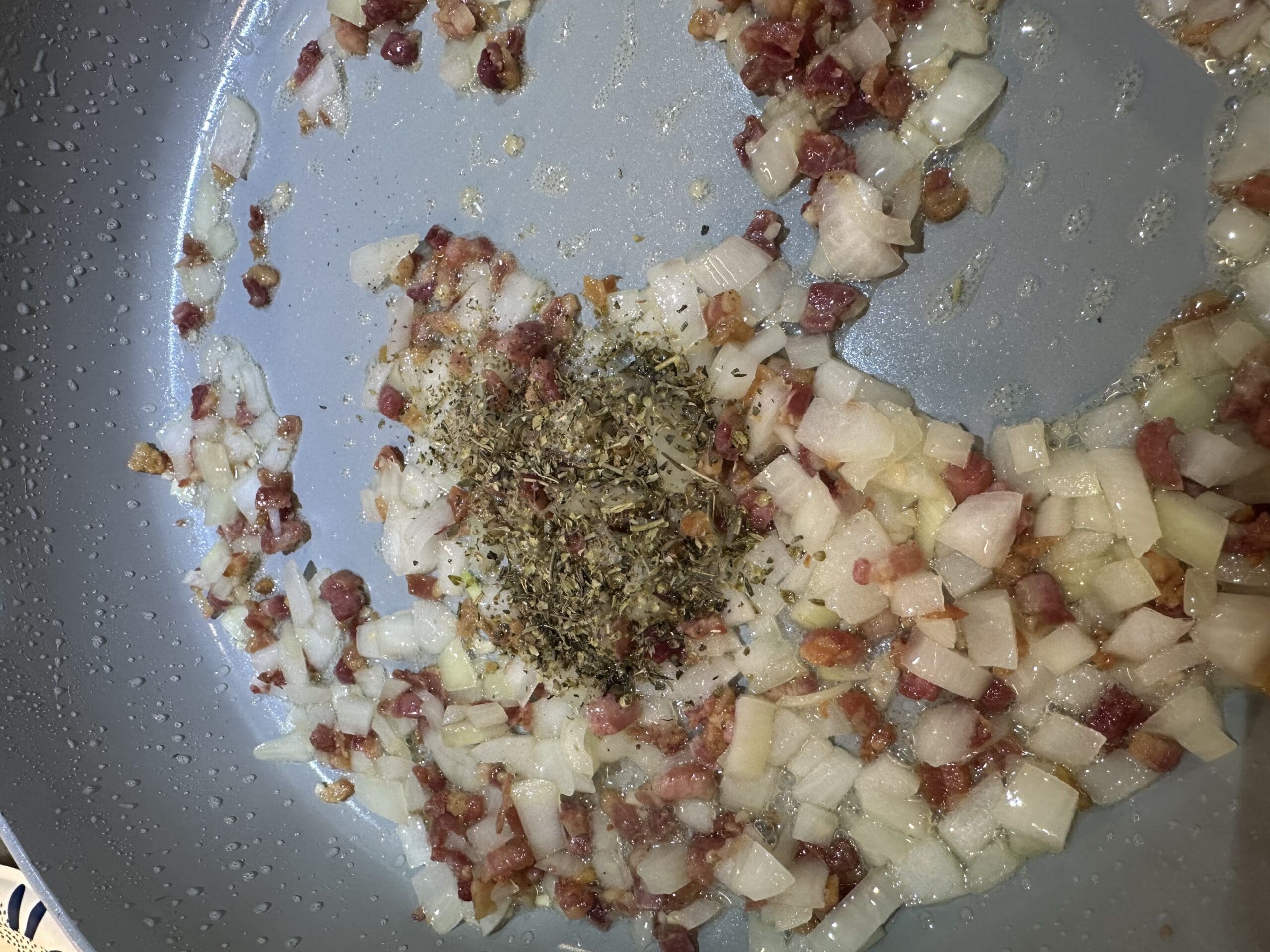 - Now add the chopped onion, garlic and Italian seasoning. Saute until the onion is soft.